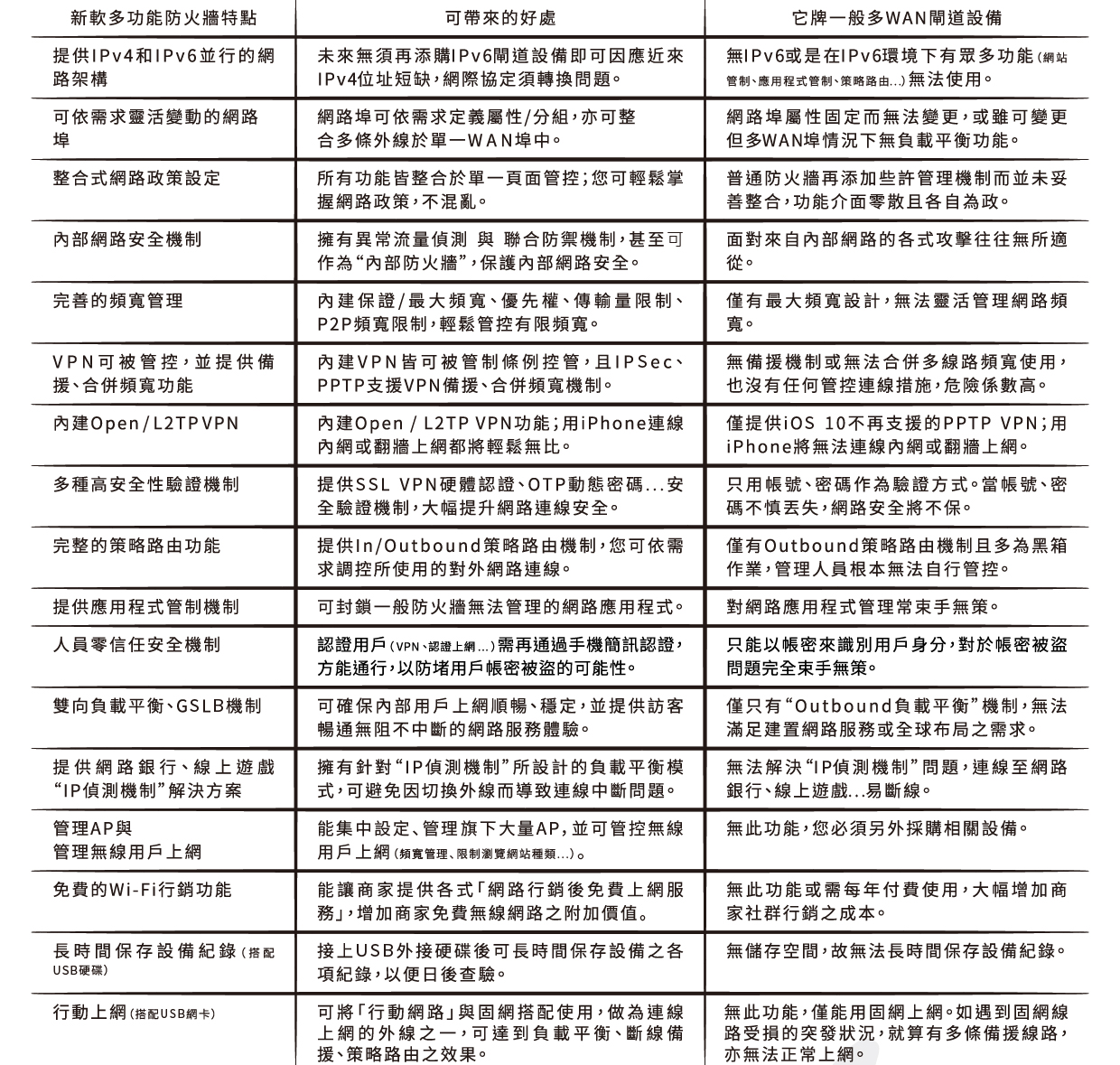 所以您除了可利⽤此產品來備援對外線路、負載平衡上網流量和防護內部網路外,選擇MHG-1700A,將為您降低設備成本,簡化複雜的架設環境,更可以利⽤其它功能管理有線/ 無線網路、頻寬及⽤⼾。