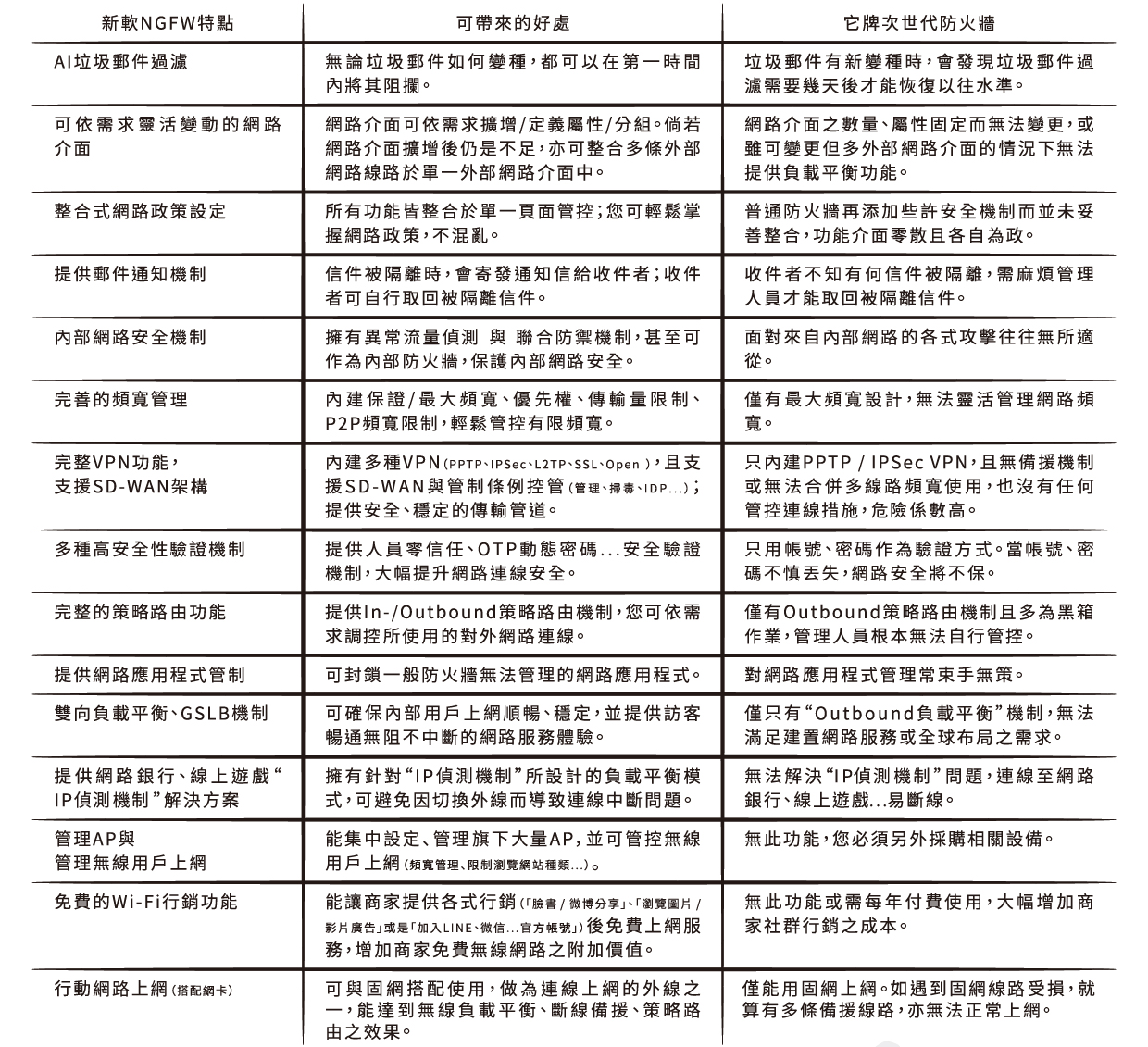 在管理⽅⾯,NGFW-2800 整合了SPI/ 內部防⽕牆、AP 控制器、網站管制、負載平衡、⾏動網路上網、頻寬管理、完整的VPN、郵件稽核歸檔、應⽤程式管制... 功能。不論是有線還是無線網路,管理⼈員都可以輕鬆掌握,⼀機⾜以達到所有需求。更重要的是,其IDP/ 垃圾郵件/ 應⽤程式特徵碼皆為永久免費更新,也沒有授權⼈數、管理AP 數量上之限制,能⼤幅降低您在採購網路設備與資訊安全⽅⾯之花費。