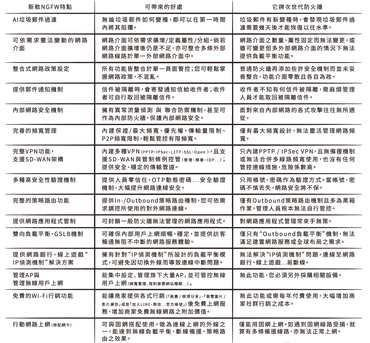 在管理⽅⾯,NGFW-3800 整合了SPI/ 內部防⽕牆、AP 控制器、網站管制、負載平衡、⾏動網路上網、頻寬管理、完整的VPN、郵件稽核歸檔、應⽤程式管制... 功能。不論是有線還是無線網路,管理⼈員都可以輕鬆掌握,⼀機⾜以達到所有需求。更重要的是,其IDP/ 垃圾郵件/ 應⽤程式特徵碼皆為永久免費更新,也沒有授權⼈數、管理AP 數量上之限制,能⼤幅降低您在採購網路設備與資訊安全⽅⾯之花費。