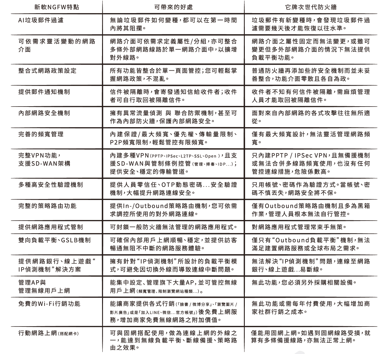 在管理⽅⾯,NGFW-910 整合了SPI/ 內部防⽕牆、AP 控制器、網站管制、負載平衡、⾏動網路上網、頻寬管理、完整的VPN、郵件稽核歸檔、應⽤程式管制... 功能。不論是有線還是無線網路,管理⼈員都可以輕鬆掌握,⼀機⾜以達到所有需求。更重要的是,其IDP/ 垃圾郵件/ 應⽤程式特徵碼皆為永久免費更新,也沒有授權⼈數、管理AP 數量上之限制,能⼤幅降低您在採購網路設備與資訊安全⽅⾯之花費。