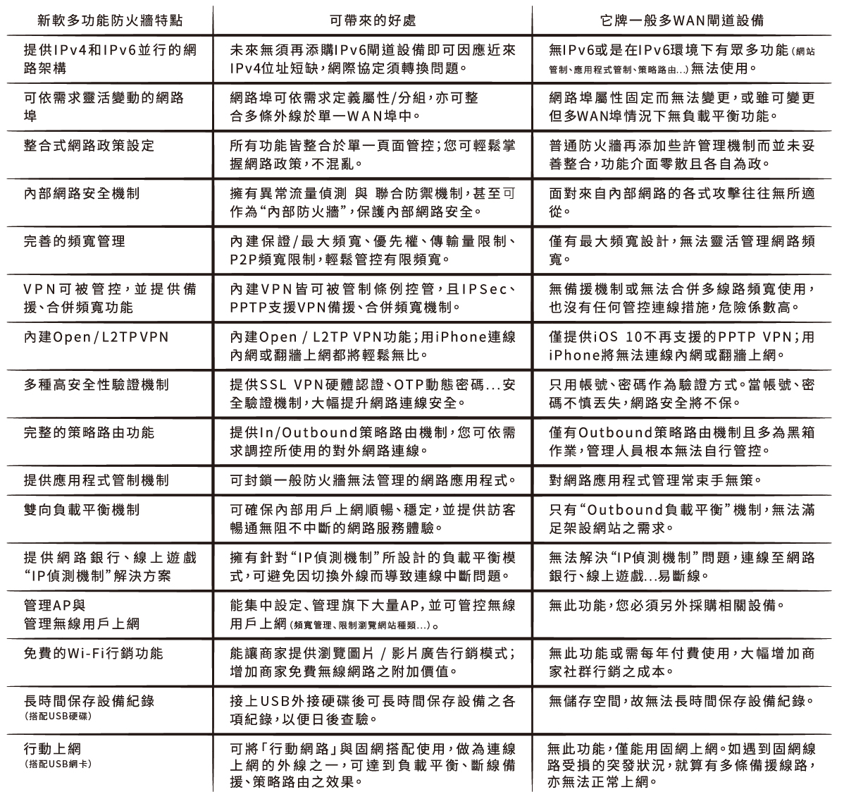 多功能防⽕牆MHG-580,⼀台擁有多個WAN 埠的⾼安全性SPI 防⽕牆,可協助您建⽴SD-WAN 的新世代網路架構,以確保資訊安全無虞。並能同時銜接多條對外線路、⾏動網卡,提供線路即時備援與負載平衡機制,可確保對外網路連線穩定與暢通。並內建了AP 控制器、交換器控制器、策略路由、頻寬管理、網站管制、AAA Server、網路應⽤程式管制、中毒警⽰功能…實⽤功能,亦提供完整VPN 解決⽅案,⼀機就可以搞定您的網路環境。